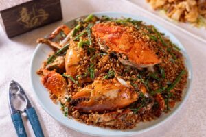 -Bi Feng Tang stir-fried crab: the crab is buried under a dry, crumbly mixture which is mostly garlic.