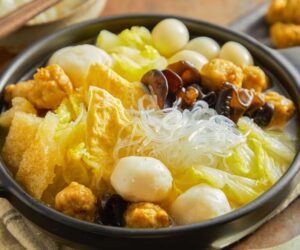 -Three-delicacies soup also known as San Xian Tang, is a hotpot soup base that combines pork bone soup, dried shrimp, and pickled vegetables.