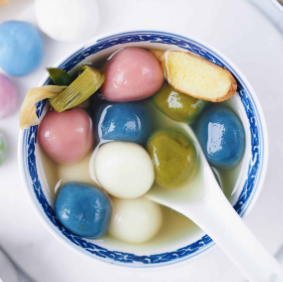–Tangyuan is glutinous rice balls, a traditional Chinese dessert made from sticky rice flour. Their round shape symbolizes reunion, harmony, and family togetherness.