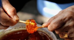 He ate a piece of peanut and licked the malt sugar candy.