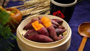 For breakfast, she had a steamed sweet potato and two boiled eggs, mashed and mixed with a spoonful of peanut butter and half a spoonful of sesame paste, which was both satisfying and filling.
