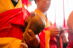 As he spoke, he very naturally pulled a wooden fish out of his wide sleeve.