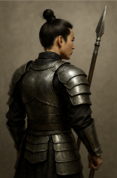 He had a topknot on his head, wore thick, shiny armor, and held a long spear in his hand. He must be filming a scene.